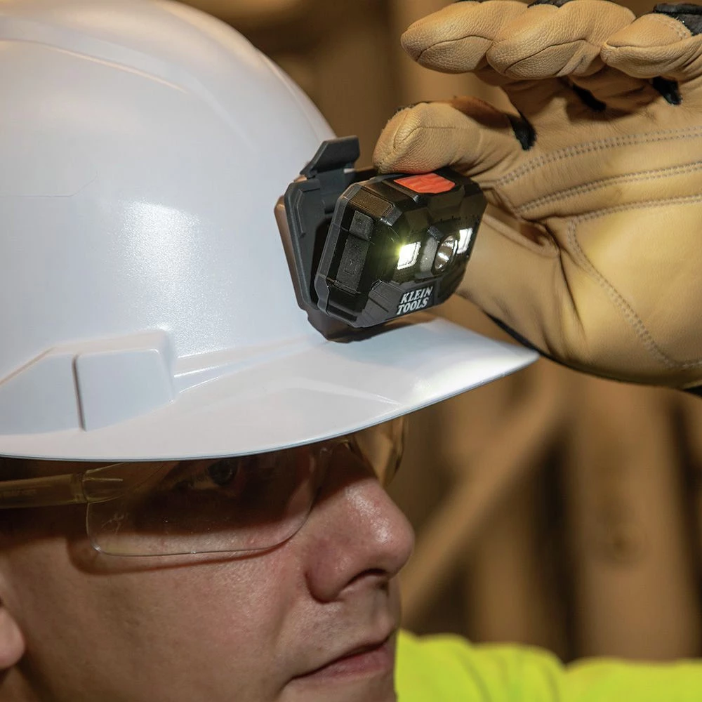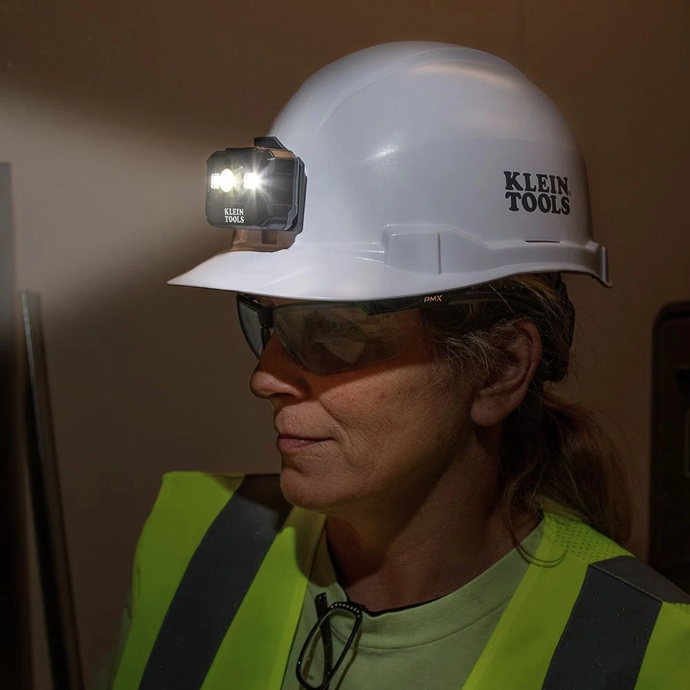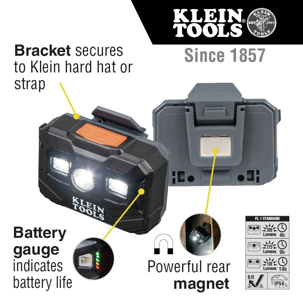 - Rechargeable headlamp attaches directly to Klein Hard Hats (equipped with bracket system)