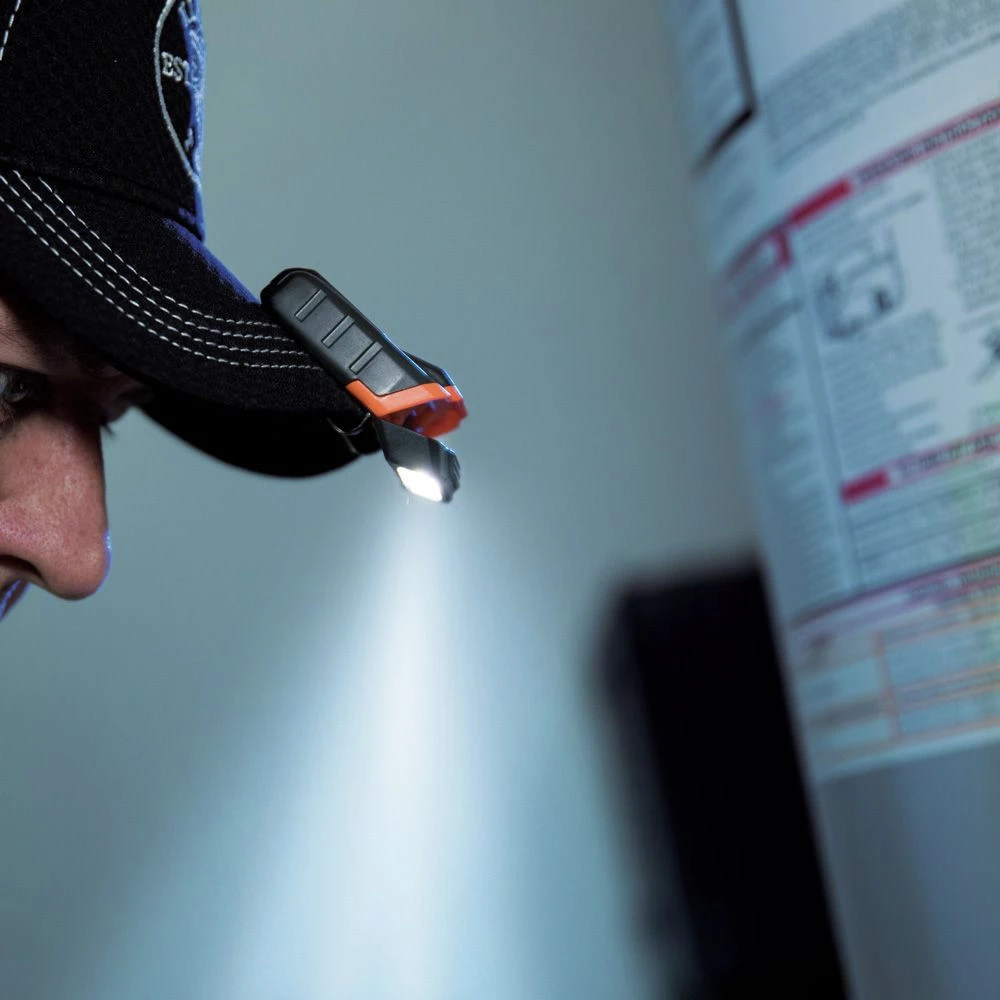 - Light’s contoured metal clip fastens easily onto the brim of a cap, hat or hard hat